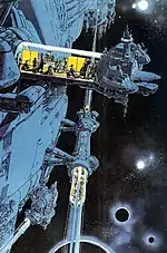 Outside of comics, Mézières' art has been especially influential on science fiction and fantasy film. In particular, several commentators, such as Kim Thompson,[24] Jean-Philippe Guerand[25] and the newspaper Libération,[26] have noted certain similarities between the Valérian albums and the Star Wars film series. Both series are noted for the "lived-in" look given to their various settings and for the diverse alien creatures they feature. Mézières' response upon seeing Star Wars was that he was "dazzled, jealous... and furious!".[27] As a riposte, he produced an illustration for Pilote magazine in 1983 depicting the Star Wars characters Luke Skywalker and Leia Organa meeting Valérian and Laureline in a bar surrounded by a bestiary of alien creatures typical of that seen in both series. "Fancy meeting you here!" says Leia. "Oh, we've been hanging around here for a long time!" retorts Laureline.[28] Mézières has since been informed that Doug Chiang, design director on The Phantom Menace, kept a set of Valérian albums and Les Extras de Mézières in his library.[1]