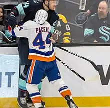 With the Senators out of playoff contention and as a potential free agent, Pageau ended his eight-year tenure with Ottawa when he was traded to the New York Islanders at the NHL trade deadline in exchange for a conditional first-round pick and a second-round pick in 2020 and a conditional third-round selection in 2021.[9] He was immediately signed to a six-year, $30 million contract extension to remain with the Islanders through 2026.[10] In his debut with the Islanders on February 25, he received a 10-minute game misconduct, scored his NHL career-high 25th goal of the season, and skated 12:07 on the third line with Josh Bailey and Michael Dal Colle.[11][12] Prior to the NHL's pause in play due to the ongoing COVID-19 pandemic, the Islanders had failed to qualify for the 2020 Stanley Cup playoffs as they lost seven straight games leading up to March 12.[13] However, they were made eligible for the newly created Stanley Cup Qualifiers when the NHL resumed play.[14] Over the lengthy pause, Pageau returned to Ottawa to spend quarantine until the NHL resumed play.[15]