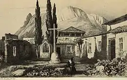 In 1840 Laurens also published a copiously illustrated memoire on Majorca – an artistic travel guide.[4] As preparation he travelled across the whole of the island, in particular visiting the Carthusian monastery in Valldemossa and the cell where George Sand and Frédéric Chopin had wintered before their abrupt departure in February 1839. In his memoire, Laurens describes the cell: Sand's pipe still in the cell; their garden with its oranges, ripening pomegranates and rustic lamp; and the cloister cemetery, a place for evening repose, which he illustrated with a lithograph. Laurens' Souvenirs would later inspire Sand's book Un hiver à Majorque.[3][5]