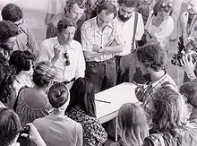 Jean-Pierre Sudre in his Southern France house, in 1975; the second person right to him (from viewer) is photographer Georges Tourdjman.