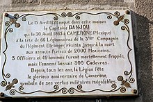 A commemorative marble plaque is affixed to the facade of the birthplace of Captain Danjou, in Chalabre (Aude, France). Every year, as close as possible to April 30, a squad of the Regiment of the French Foreign Legion at Castelnaudary comes to pay him military honors and the colonel of the regiment lays a wreath at the foot of the facade. Other commemorations also take place in Aubagne (Bouches-du-Rhone, France) where the headquarters of the Legion is located.