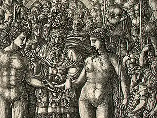 A Jean Duvet from Dijon is also recorded working as a goldsmith in Calvinist Geneva from 1540–56, but most scholarly opinion now believes that this was someone else, probably his nephew.[2] The question perhaps cannot be regarded as entirely settled. The Geneva Duvet was recorded as the son of "Loys Duvey, alias Drot de Dijon", probably Jean Duvet's brother, who became a Master in 1509. Eisler and Blunt favour the Geneva figure being Duvet himself, followed by Marqusee; Zerner and R. May do not. Yet another Jean Duvet, working as a goldsmith in Geneva, was condemned to death for extortion in Geneva in 1576.