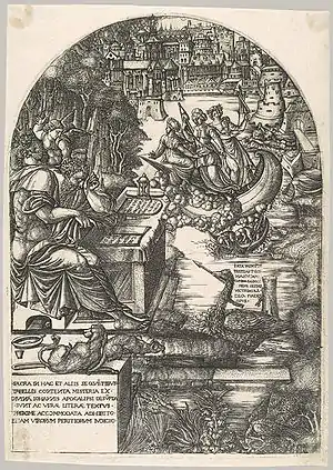 His most famous works are his series of twenty-three engravings on the Apocalypse, the frontispiece of which (above) is dated 1555. They borrow heavily from the famous series in woodcut of Albrecht Dürer (1498) but are very different in style - crowded, even confused, but urgent and intense. Eight of the series derive their composition in some way from Dürer.[17] This was published, with the accompanying text, in Lyon in 1561. Like many of his mature prints these use a round-topped shape. The frontispiece has the Latin inscriptions: "Jean Duvet goldsmith of Langres aged 70 made these histories 1555" (on the plate on the table) and "The Fates are pressing, already sight fails, the mind remains victorious, and the great work is completed" (by the swan), suggesting this was last of the series to be completed.[18]