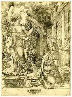 He was born to a Dijon goldsmith in 1485,[3] presumably in Dijon itself, which until a decade before had been part of the independent state of the Duchy of Burgundy. He became a master of the Dijon Goldsmiths' guild in 1509, and may have travelled to Italy in about 1519; this is purely an inference from his prints, which show considerable Italian influence. His first dated print is The Annunciation from 1520, although others are probably earlier. A misunderstanding of the nature of a pilaster in this print, which shows a putto wrapped round one as though it were a thin sheet, unattached to the wall behind, perhaps suggests that his understanding of the Italian style was derived purely from prints, books and other objects brought back to France.[4] Although he remained in the provinces, he was appointed goldsmith to both Francis I and Henry II. The first of these appointments was on the occasion of the King's visit to Langres, where he was already living, in 1521; he had been involved in the decorations for the Royal Entry.[5] By the next royal visit, in 1533, he was in charge of the festivities and decoration. The influence of pageant tableaus and scenery has been detected in his prints. No identified examples of his goldsmithing survive, though commissions for Francis I and others are documented.[2]