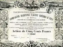 In 1861 the elder Joseph Valéry died and his nephew Joseph became the sole manager of the Compagnie des Paquebots de la Méditerranée.[5][12] Joseph Valéry established himself in Paris as one of the leaders of French maritime trade. He became master of the Grand Orient de France Freemason lodge "la parfaite harmonie française" in Bastia. He was made a papal count by Pope Pius IX.[5] Under Valéry the fleet expanded from 12 to 33 ships, and the capital from 120,000 to 12 million francs. The company provided cabotage service to the Corsican ports, operated lines between Corsica and Marseile, Nice, Toulon and Sardinia as well as links from Marseille to Tunisia, Algeria and Spain. Valery used his wealth to build a splendid mansion in Bastia, demolished in the 1950s.[13]