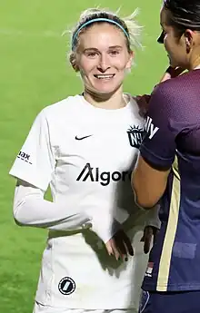 Nighswonger signed a three-year contract with Gotham FC on March 17, 2023.[32] She made her NWSL regular-season debut with Gotham FC, substituting for an injured Ali Krieger during the club's 2023 NWSL season opener at Angel City.[33] Though she primarily played as an attacker during her college career, head coach Juan Carlos Amoros played her at outside-back during her first professional season.[34][35] She played in 20 league games, starting in 17. She scored three goals and played over 1,500 minutes during the regular season.[36] The NWSL named Nighswonger its Rookie of the Month in May and July, making her the only player to earn the award twice.[37][38] She was named Rookie of the Year on November 8, 2023.[39] Nighswonger played in every game of the NWSL postseason, helping Gotham FC lift the NWSL Championship trophy on November 11, 2023.[40]