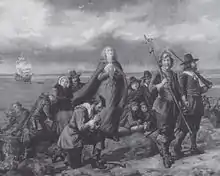 She made a painting of the landing at Plymouth Rock about 1920 entitled Landing of the Pilgrims with a woman of "Botticelli quality" as the central figure in a pyramid shaped composition. According to author and historian John D. Seelye, "Hers is a tender presence guarded by the advancing figures of Miles Standish with pikestaff and sword and a Pilgrim (probably John Carver) with a blunderbuss, but it reminds us that by the tercentenary year women in America were gathering political strength."[30]