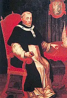 ![]() Jerónimo de Loayza, wearing the pallium over the choir dress of a Dominican bishop | |