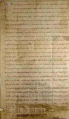 At Jerome's arrival in Valencia, Rodrigo gave him a property at Yubayla (now El Puig), which had been conquered in July 1093.[11] After the conquest of Valencia in 1094, Rodrigo wanted to replace the native bishop of the Mozarabic rite[lower-alpha 5] with one of the Roman rite.[9] According to a later source, he asked Bernard of Sedirac to send him a new bishop for Valencia. If Jerome was sent by Bernard,[lower-alpha 6] he was sent as a mere priest, not yet consecrated a bishop. According to a document drawn up for Rodrigo, Jerome was "canonically elected with the agreement of the people" in Valencia.[11] He then travelled to Rome to be consecrated "by the pope's hand" (per Roman pontificis manus), becoming thereby the first bishop of Valencia in connection with the wider church in about a century.[1] The dates of his election as bishop and of his trip to Rome are not clear. Sometime after the conquest of Murviedro on 24 June 1098,[14] the old mosque of Valencia was consecrated as the new cathedral dedicated to the Virgin Mary.[13] That same year, after the consecration of the new cathedral, Rodrigo made the church a large endowment of his personal property. The charter of this endowment, possibly drawn up by Jerome himself,[15][16][17] survives in its original form with Rodrigo's autograph. Jerome and the priests of the cathedral then pronounced excommunication and anathema on anyone who would deprive the church of this gift.[8] The charter also specifies that Jerome "raised by a special privilege of freedom" (specialis priuilegii libertate sublimato) from the pope, probably a reference the church of Valencia being exempted from any metropolitan authority and being subject only to the pope.[11][13] The charter implies that Jerome was not elevated to the bishopric until after the consecration of the new cathedral, but historian Bernard Reilly has argued that Jerome's trip to Rome must be placed in the first half of 1098.[12]