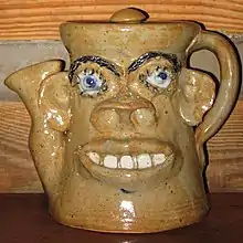 As inheritor of both Brown and Stewart pottery traditions[2] Brown produced utilitarian stoneware in the nineteenth and early twentieth century styles as well as to create innovations for more modern usages, such as his apple baking dishes, chicken cookers and microwave bacon cookers.[8] However much of his critical acclaim centered on recognition of his unique style of whimsical art, especially face jugs. (According to his mother he had learned the basics of whimsical pottery making from his father, as the Stewarts did not have a face jug tradition.)[4]