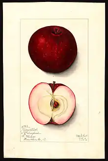 The Jersey Black apple is an old North American variety of apple, or Malus domestica; it is thought to have originated c. 1817, but has fallen somewhat out of favor. It is also known as the Black Apple because its skin is very dark red, appearing almost black. It is a dessert apple with sweet white firm flesh. It was once used for the production of cider. This variety is notable for a cross with a McIntosh red to produce the Macoun.