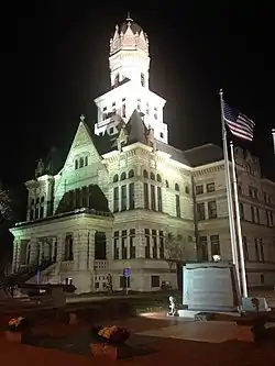 The Jersey County Courthouse, located on 201 W. Pearl Street in Jerseyville, is Jersey County, Illinois' county courthouse. Built in 1893–94, the 124 foot (37.8 meter) tall courthouse was the third used by the county since its formation in 1839. Architect Henry Elliott of Chicago and Jacksonville designed the building in the Romanesque Revival style. The building's design features a tall central tower topped by an octagonal cupola, terminal towers at the front corners, and a raised front porch. The building's limestone exterior, which is intricately decorated on the front face, uses stone quarried at the nearby city of Grafton. The Jersey County Illinois courthouse was the third courthouse designed by Mr Elliott who also designed the Greene County Courthouse (1891) in Carrollton, Illinois; Edgar County Courthouse (1891) in Paris, Illinois; DeWitt County Illinois Courthouse (1893) in Clinton, Illinois and Pike County Illinois Courthouse (1894) in Pittsfield. The DeWitt County Courthouse was demolished in 1987.[2]