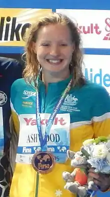 At a 2009 transtasman swimming meet, Ashwood beat Kiwi Phoebe Williams to finish first in the 800-metre freestyle event.[5] At the 2009 Australian Youth Olympic Festival, she lost to Kelly Marquenie in the women's 800-metre freestyle event.[6] She finished second in the women's 400-metre freestyle event.[7] At the 2011 Queensland State Championships, she came in second in the women's 800-metre freestyle event, finishing seven seconds behind the winner.[8][9] At the 2011 National Championships, with a time of 16:14.47, she finished second in the 1500-metre freestyle which secured her a spot on the national team going to the World Championships.[10] At the 2011 World Swimming Championships, in her national team debut, she did not make it out of the semifinals in the 1,500-metre.[11][12] At the 2011 Junior Pan Pacific Championships, she finished third in the 400-metre freestyle with a time of 4:12.47.[13] At the 2012 Australian National Championships, she finished second in the women's 800-metre freestyle with a time of 8:27.97.[14] As an 18-year-old,[3] she was selected to represent Australia at the 2012 Summer Olympics in the 800-metre freestyle event[2][15] in what were her first Games.[3][4]