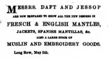 - ↑ "William Daft, Silk Mercer, Haberdasher, &c". Nottingham Review and General Advertiser for the Midland Counties. England. 27 March 1840. Retrieved 12 March 2018 – via British Newspaper Archive.