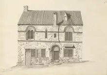 Part of the original façade survives; the elaborately carved doorway, the remains of two Romanesque double-arch windows and much of the stonework on the upper storey. A chimney breast rises over the arch above the front door, serving the fireplace on the upper floor. There were once two columns supporting the arch, but these have gone.[3]