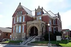 Jewett Norris Library, also known as Grundy County Jewett Norris Library, is a historic library building located at Trenton, Grundy County, Missouri. It was built in 1891, and is a 2 1/2-story, Romanesque Revival style red brick and limestone building. It has a high stone base and broad stone steps leading to a porch with heavy, round stone arches.[2]:2