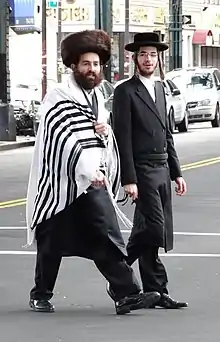 Hasidic men in Borough Park, Brooklyn. The man on the left is wearing a shtreimel and a tallit, and the other man traditional Hasidic garb: long suit, black hat, and gartel.