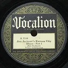 "Jim Jackson's Kansas City Blues" is a 1927 song, written and recorded by the American blues musician Jim Jackson. He recorded it on October 10, 1927 for Vocalion Records, who released it as a two-part A-side and B-side single. It was Jackson's first record and an early blues hit.[1] Music writer Peter Silvester suggests it was one of the first million-seller records.[2] This sales figure is disputed, but the recording was "immensely popular... and became a standard among Mississippi and Memphis bluesmen".[3]