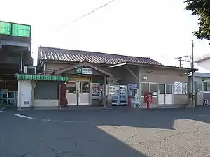 The station has one side platform and one island platform serving three tracks, connected by a footbridge, with a single-story station building. The station is staffed.