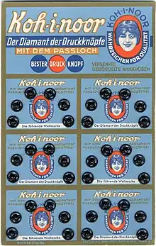 Karel Waldes, father of Jindřich, had an inn and a small haberdashery shop in the village of Nemyšl near the town of Tábor in southern Bohemia. He wanted his son to continue his business but Jindřich found a position of a clerk at the firm of Eduard Lokesch and Son in Prague. This company made buttons and cufflinks. As Waldes had a good knowledge of languages he became Lokesch's business agent and travelled the world on behalf of the firm. In 1902 together with an engineer Hynek Puc (1856–1938) Waldes left Lokesch and founded his own company Waldes a spol. A year later Puc invented a special machine that inserted a small spring into concealed dress fasteners, the main product of the new firm. The new machine supplemented labour of ten skilled workers. With the increased production Puc kept inventing more machines to support the manufacture of pins, safety pins, needles and buttons. The world-renowned Waldes trademark, Miss KIN, came about in 1912 when Waldes on his ocean trip met Elizabeth Coyne[1] who playfully put one fastener in her eye. František Kupka painted her portrait in oils and Vojtěch Preissig from it designed the firm’s trademark. The other trade names used were Koh-i-noor and Otello.