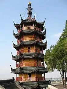 The 36-metre (118 ft) pagoda is octagonal with seven stories. It was originally built in the Southern Dynasties (420–589) and refurbished in the Yuanfu period (1098–1100) of the Song dynasty (960–1279). The present pagoda was rebuilt in 1900, in the 26th year of Guangxu period (1875–1908) of the Qing dynasty (1644–1911).[2][3][4]