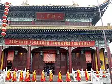 The Mahavira Hall is rebuilt in 1989 with double-eaves gable and hip roof. The hall enshrining the statues of Three Life Buddha, namely Sakyamuni, Amitabha and Bhaisajyaguru. At the back the hall enshrines the statue of Guanyin with Shancai standing on the left and Longnü on the right. The statues of Eighteen Arhats stand on both sides of the hall. In the center of the eaves of the hall is a plaque, on which there are the words "Mahavira Hall" written by former Venerable Master of the Buddhist Association of China Zhao Puchu.[3]