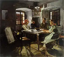 While recognition was belated, Petkovšek is now generally accepted among Slovenia's most important artists of the late 19th century, and he is considered a forerunner of expressionist movement that followed his death. He was the first artist to paint agricultural life in Slovenia,[10] but his sometimes haunting depictions of the isolation of that bucolic life, best seen in Izplačevanje koscev (1884) and Doma (Home, 1889), point to a dark modernism and existentialism for which he became posthumously famous. Art historian and professor Milček Komelj wrote that Petkovšek had no contemporary comparisons in the Slovenian art world, most of whom were considered realists and impressionists; in fact, Petkovšek ignored the accepted norms of the academic realism of the time with his use of colors in strong contrast. Komelj also wrote that Petkovšek’s Doma (Home) is the only Slovenian painting from the 19th century which later became so influential that it received the respect of the fine arts and literary communities and was the subject of artistic homage. Komelj even posited that the artist is sometimes thought of as the Slovenian van Gogh because his work directed the development of art in his country into the 20th century in terms of modernity and creativity.[11] The first major retrospective of his work was exhibited at the National Gallery in Ljubljana in 1982, and other exhibits followed in 1999 and 2015.