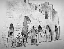Joannes Roucourt, father of the poor. The charity of Joannes shone especially during the eight years the plague knocked about the Brussels region. He often stood for hours at the city walls on the side of Schaerbeek. He there found people who were infected with the disease and who wanted to cleanse their souls of sins, from whom he took their confessions. Then he comforted them and sent them -strengthened by alms- to the common hospital. Artist's impression (2015) by Ronald H. Recourt.