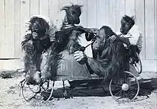 Three juvenile orangutans, said from to have come from Borneo in crates stuffed with "jungle grass," joined the Universal City menagerie around March 1921.[101] Two, called Jiggs[lower-alpha 10] and Kelly, had their own enclosure with a "heat plant" and wore "little pneumonia jackets of flannel Mrs. Stecker has made for them."[22][lower-alpha 11]