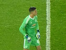 On 31 August 2016, he joined Primeira Liga club Belenenses on loan.[14] His loan spell ended on 5 January 2017, due to Manchester United's third-choice goalkeeper Sam Johnstone joining Aston Villa on loan.[15] Pereira made his Manchester United debut on 29 January 2017, in an FA Cup fourth round tie against Wigan Athletic, coming on as an 80th-minute substitute for Sergio Romero.[16][17] On 21 May 2017, he started for the first time in the Premier League, against Crystal Palace at Old Trafford.[18]