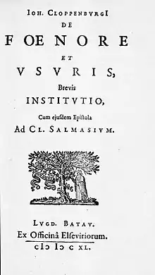 - ↑ Johannes Cloppenburg (1637). Christelijcke onderwijsinge van woecker, interessen, coop van renten ...: waer inne aen Godts H. Woordt ghetoetst werden de keyserlijcke ende de pausselijcke rechten ende de daghelijckse prackijcke der Christenen ... Theunis Jacobsz. Retrieved 2 September 2012.