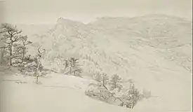 His works were mainly groups of mountain ranges, which were very effectively rendered, and possessed an excellent tone — the execution being simple and true to nature.[5] The Mountain Tarn and the View on the Zillerthal may be particularly noticed. There are thirty-five careful etchings of landscapes by him, some of which were published by the Art Association of Copenhagen in 1850 and 1851.