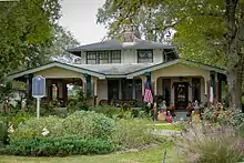 In 1920, Louis A. Machemehl commissioned Houston architect, Alfred C. Finn, to design the L.A. and Adelheid Machemehl House in Bellville, Texas. The structure is a 1+1⁄2-story house built in Airplane Bungalow style. The upstairs portion is set behind a large wrap-around porch. Many festivities and social occasions took place on that porch for the local community. These festivals including dances for the youth of the city to the music of a Victrola. The house has a southwestern view of the historic German Texan settlement of Cat Springs. In its present condition, large oaks and magnolias trees surround the house. It is located one and a half miles from the town square.[13] The architect's original watercolor rendition and floor plans are in the archives of the Houston Public Library.[14] The structure is recorded as a Texas Historic Landmark of the Texas Historical Commission. It was originally built for Louis A. Machemehl, his wife Adelheid Machemehl (d. 1949), and their five children (including Charles W. Machemehl). The landmark remained in the Machemehl family until 1953.[15][16][17]