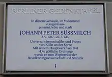 Süßmilch studied medicine and theology at Jena and Halle and in 1741 was an army chaplain in the First Silesian War. On Sunday, 13 August 1741, the former field preacher gave his inaugural sermon as pastor of the community Etzin.[1] In 1742 he took a post as Provost in the St. Petri parish in Berlin-Cölln. He became a member of the Prussian Academy of Sciences in 1745. He conversed with Gotthold Ephraim Lessing and Immanuel Kant.