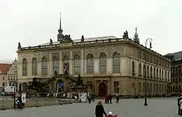 The Johanneum was built between 1586 and 1590 as the Stallgebäude, the stables of the adjacent Dresden Castle.[1] Both horses and armoury collection of the Saxon dukes were housed here; two halls on the building's ground floor provided space for 128 horses. The upper floors were designed as collection rooms for the vast collection of princely armoury, wardrobe and utensils for pageants of the Dresden court. The Renaissance-era building was designed as one of the first autonymous collection buildings in central Europe by Paul Buchner on behalf of Prince Elector Christian I of Saxony.[1]