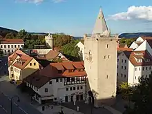 The Johannistor is the only remaining preserved city gate of the city of Jena, Thuringia, Germany. As part of the medieval city wall, it is connected to the Pulverturm (a tower, also preserved) via a reconstructed walkway. The outer gate remained in existence until the beginning of the nineteenth century, when it was demolished as a result of increasing traffic.[1] Until the houses lining the south side of Johannisstrasse were demolished in 1968, the Johannistor remained the only western entrance to the old town of Jena.