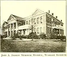 After being given to the Tuskegee Institute in 1911, it was dedicated on February 21, 1913, as a result of which it was renamed. It was rebuilt using money donated by the wife of Charles E. Mason, a trustee of the Tuskegee Institute. It was named after Mrs. Mason's grandfather, former Massachusetts governor John Albion Andrew.[4] In a 1919 article in the Nation's Health, Kinney described the hospital as "a modern, up-to-date, well-appointed, two-story brick building, with accommodations for sixty patients with no crowding, and for a good many more when it is necessary."[5] The Tuskegee Syphilis Study took place at the hospital, thanks to the approval of both Eugene Dibble (then the hospital's medical director) and Robert R. Moton (then the president of the Tuskegee Institute).[6][7]