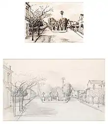 Aldridge's pen and ink drawing of San Severo and a pencil drawing of the same scene, circa 1944 or 1945. The pencil drawing is on the back of an aerial reconnaissance photograph.