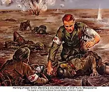 Painting of Capt. Sinton attending a wounded soldier at Orah Ruins, Mesopotamia