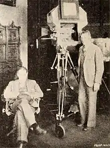 John Anderson (standing) with Lionel Barrymore on the set of the 1929 film, The Unholy Night, the housing around the camera is Arnold's invention, the "bungalow"