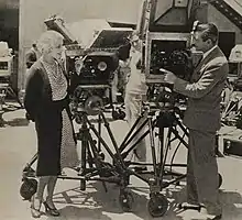 Arnold was elected to his first term as president of the American Society of Cinematographers in 1931, a position he would hold through 1937. He had previously been the treasurer of the organization.[24][25] During the year he became a major force in campaigning for Cinematographers to receive on-screen credit.[26] In 1932, American Cinematographer, the official magazine of the American Society of Cinematographers, decided to run a contest for the best amateur film, offering a $1000 prize. Arnold was selected to be one of the judges.[27] Late in 1932 Arnold was elected to the Technical Committee of the Motion Picture Academy (MPA).[28] Also in 1932, Arnold oversaw the creation of a standard testing practice by the ASC, whereby they would test all technical moving and still equipment. Equipment which passed the test were eligible to use the "Approved by A.S.C." tag in their advertising.[29][30] In the early 1930s, Arnold developed an attachment for the Mitchell Camera, which reduced the noise created during filming. It was a 48 cycle synchronous motor used to drive the camera, and it greatly reduced the vibration, and completely eradicated the noise of the motor. Along with a new version of the camera which was introduced in 1933, it was hailed as "...the greatest forward step in recent years." The combination of the new camera with the Arnold motor allowed the camera, without a hood (or blimp), to be used as close as a yard from the microphone.[31] Another invention of Arnold's in the early 30s was a rolling tripod, which would be further refined by Mole-Richardson company, which gave it the name, the "Mole-Richardson rolling tripod".[32][33] Arnold also invented the MGM camera crane, which was a substantial improvement over prior versions. it was about half the size of earlier versions, and 1/17 as heavy, as well as cutting costs by 90%. It elevated to 26 feet, weighed 3300 pounds, and cost $3,500. The crane could swing through a complete horizontal circle, while the arm could rotate 90 degrees. During this same period Arnold also designed the "rotambulator", a radically new design of camera dolly, which allowed a stable platform to move from about 18 inches off the floor to a height of eight feet. The operator could also rotate the entire assembly through a complete 360 degree circle.[34] Arnold was also an avid 16mm camera fan, and would share his expertise with anyone who showed an interest. One of those he taught was Clark Gable.[35][36] With the passage of the National Industrial Recovery Act of 1933, the National Recovery Administration was created, and part of its responsibilities included the creation of a motion picture code. At the hearing held in Washington D.C., Arnold was included as one of a long list of speakers who had requested to be heard.[37] His attendance at the hearings in Washington caused him to miss the wedding of his good friend, Lee Garmes, for whom he was supposed to be the best man.[38] By the end of 1933, Arnold's rotambulator was in use at several studios, replacing the tripods, dollies, and light cranes.[39]