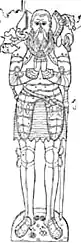 The brass bearing those parts of the inscription enclosed in brackets has been lost. In the upper part of the stone are the finely cut figures in brass of Sir John Arundell and his two wives. Sir John is in the military costume of that period; behind his right shoulder rises a staff bearing a square banner of a knight banneret, the matrix alone surviving as the brass itself of this with the crest and a portion of the helmet and lambrequin, upon which the head of the knight rests, has been lost;[28] the banner was probably charged with the quartered coat of Arundell without any impalement.[29]