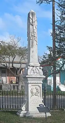 On February 18, 1871, "Magruder, having been unwell for several days, suffering from disease of the heart, breathed his last about 3 o'clock Saturday morning at the Hutchins House".[91] He was buried in Houston's Episcopal cemetery.[91] Soon after his death, the citizens of Galveston formed a committee to have Magruder's remains moved to the island. On January 10, 1876, his body was reinterred in Galveston's Episcopal cemetery and a monument was erected there in 1894.[92]