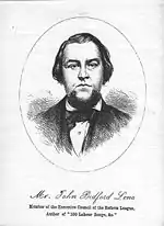 John Bedford Leno (29 June 1826 – 31 October 1894) was a Chartist, radical, poet, and printer who acted as a "bridge" between Chartism and early Labour movements, as well as between the working and ruling classes. He campaigned to give the vote to all common men and women, driven by a strong desire for "justice and freedom for all mankind". He was a leading figure in the Reform League, which campaigned for the Reform Act 1867. He was called the "Burns of Labour" and "the poet of the poor" for his political songs and poems, which were sold widely in penny publications, and recited and sung by workers in Britain, Europe and America. He was an entertaining and persuasive orator and his speeches were in great demand around London. He owned, edited and contributed to Radical and Liberal newspapers and journals, and printed and distributed bills advertising London Reform meetings and demonstrations. He wrote the international hit 'The Song of the Spade'.[1]