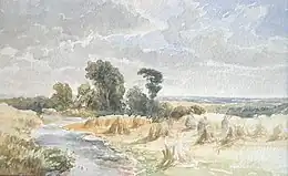 In May 1910 it was reported that "a number of oil-paintings and water-colour drawings" by the late John Brunton had been hung in the foyer of Her Majesty's Theatre in Melbourne. The works were available for sale, with the proceeds "for the benefit of his widow" (Cecily Brunton).[79]