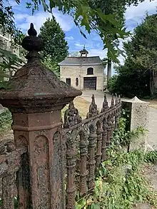 Carriage house at 35 Waban St Newton, MA with remaining portion of iron fence.