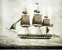 Midshipman John Biddulph joined Lieutenant John Bailie's party aboard the convict transport Chapman under Captain John Milbank and the ship sailed from Gravesend, Kent on 3 December 1819.[1][2] Also on board were his father Simon Biddulph (17 May 1761 Tamworth, Staffordshire – 5 January 1842 Bathurst, Eastern Cape), his mother Ann Burnet (August 1765 – 10 February 1844), and his siblings Louisa (24), William (14) and Frances (12). After anchoring in Table Bay on 17 March 1820, the ship was placed under quarantine because of an epidemic of whooping-cough on board which led to the deaths of six children. Captain Milbank went ashore to marry one of his passengers, Sarah Eliza Reed.[3] The Chapman was the first Settler ship to arrive in Algoa Bay on 10 April 1820.