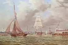 William, John and their sister Caroline lived in Great Yarmouth for many years, the brothers chiefly producing watercolours.[25] A number of picture collectors in the town actively purchased contemporary art, including paintings by the Joy brothers.[18] They included the Lacon family of Ormesby,[26] the Reverend John Homfray,[27] Mr. Croker, Mr. Freeling and Mr. F. Turner.[28] Although known as marine painters, the Joys also produced landscape sketches, some of which are in public collections.[29]