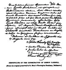 In March 1790, Carroll sent a message of congratulations, along with a blessing, to the newly elected President George Washington on behalf of all American Catholics.[25] In 1795, at Carroll's request, the Vatican appointed Reverend Leonard Neale as a coadjutor bishop in Baltimore to assist him.[26]