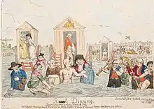 Nixon made many visits to Ireland and around Britain in the 1780s and 1790s, combining business and pleasure, as he made sketches of the places he visited. He also travelled on the continent, his first such tour being in 1783–1784. Some of his topographical drawings were included in William Watts‘s Seats of the Nobility and Gentry (1779–1786), and in 1786 the Royal Academy hosted an exhibition of his illustrations for Laurence Sterne’s Tristram Shandy. In 1791 he was joined on one of his journeys to Ireland by Francis Grose, and the next year was in Bath with Thomas Rowlandson. He became a friend of the writer Elizabeth Craven while she was living at Brandenburg House, Hammersmith, and notably acted in plays staged there. He drew many popular caricatures, which were often published by William Holland. These tended to satirise social events.[1]